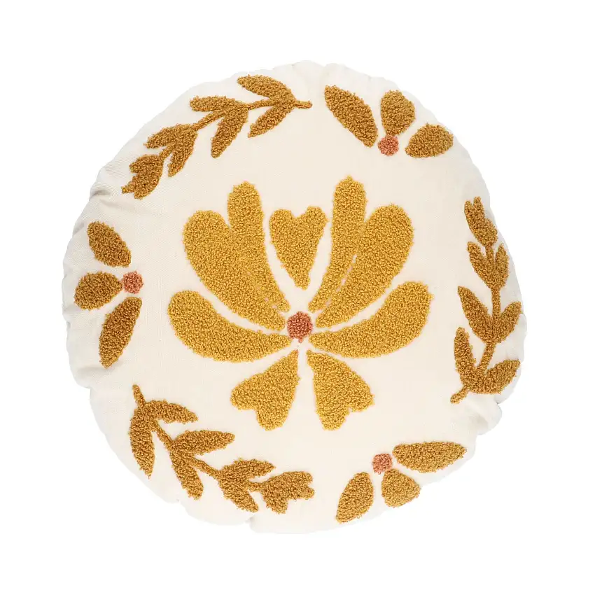 Coussin en velours, coton bio, rond, Ø 40 cm, dessin ocre sur fond blanc cassé
