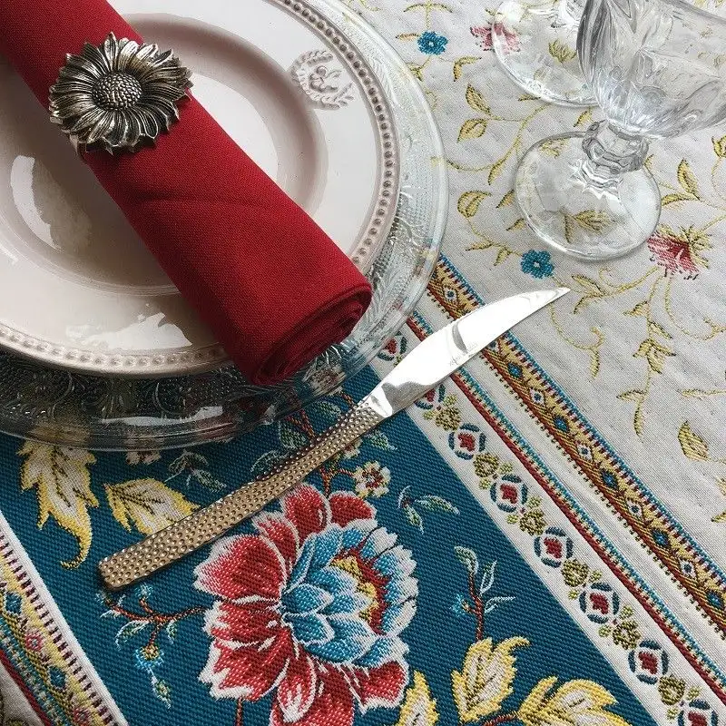 Nappe carrée Jacquard « Roussillon » bleu et or, Marat d’Avignon