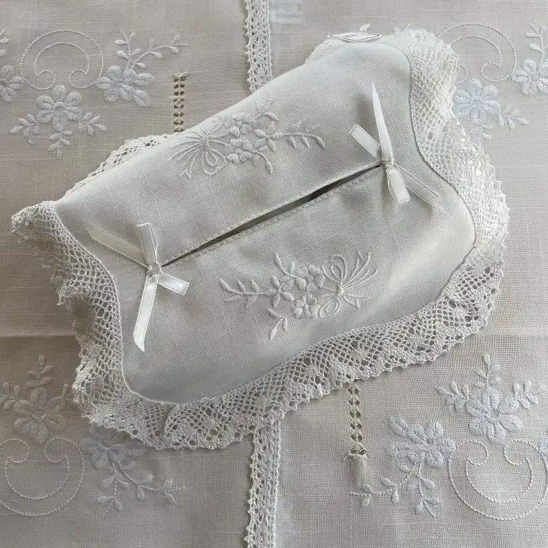 Housse pour boîte de mouchoirs « Bouquet de fleurs » brodées et dentelle blanc